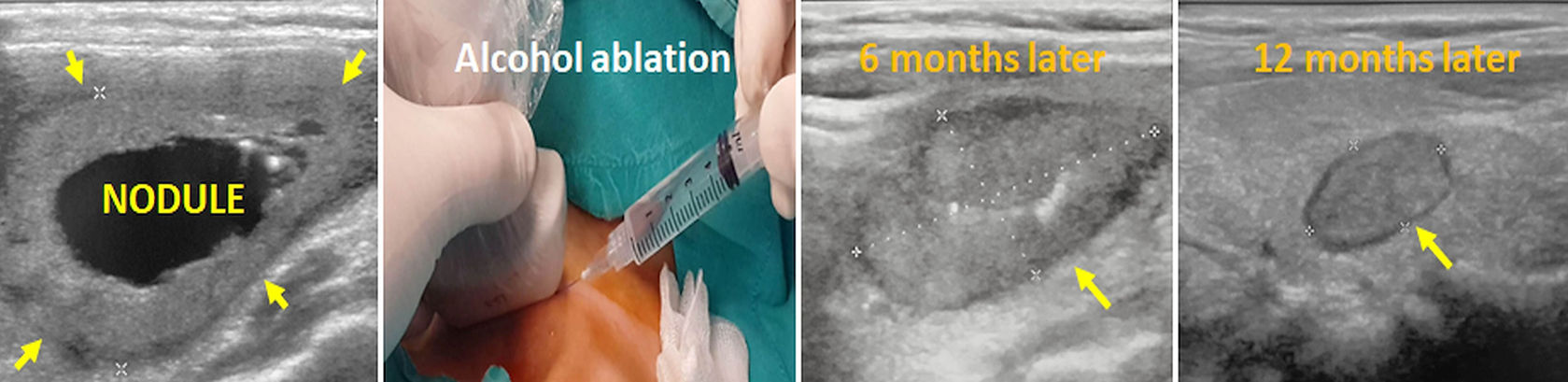 Alcohol ablation is considered the first line therapy for cystic nodules of the thyroid. It is as successful as laser and radiofrequency in the treatment of predominantly cystic nodules. It can also be used in solid nodules, but in such cases, alcohol ablation is technically more challenging and should be performed only in experienced centers. After alcohol ablation, the destroyed nodule becomes smaller in size, and this shrinkage continues for months.