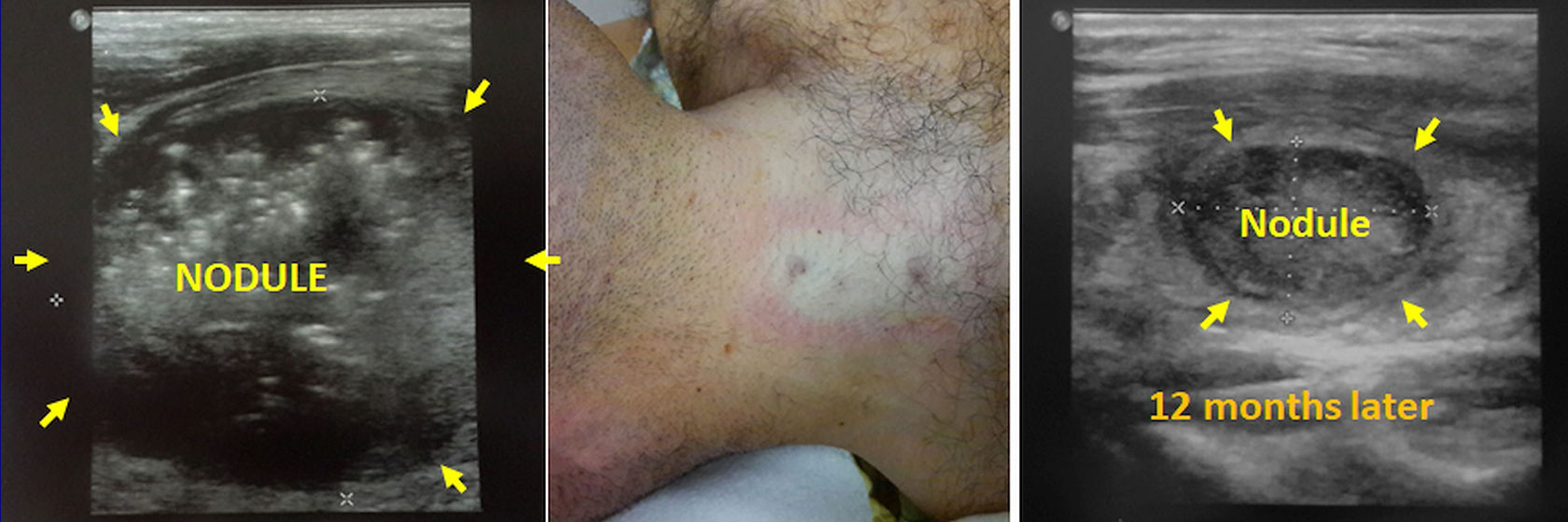 Our patient with 4 thyroid nodules (the largest one: 44x34x27mm, the nodules contained cystic areas): Alcohol ablation was done for all the nodules, which shrank subsequently. On 12 months ultrasound control, the largest nodule showed 85% volume reduction.