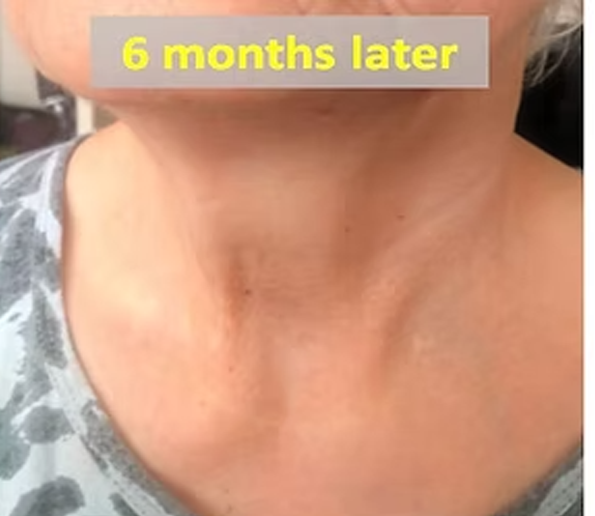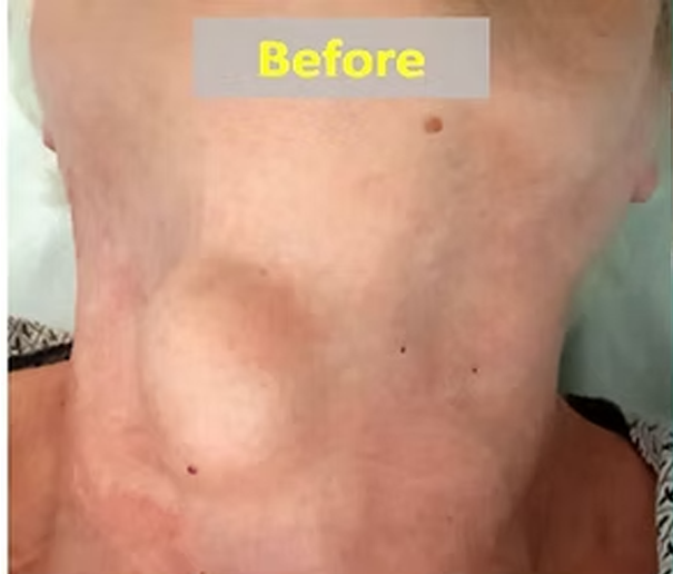A 72 year old female with a 4cm benign solid nodule in the right thyroid lobe underwent radiofrequency ablation. The patient had hemithyroidectomy 20 years before. Six months after the treatment, the volume of the nodule decreased by 90% and the appearance of the neck returned to normal.