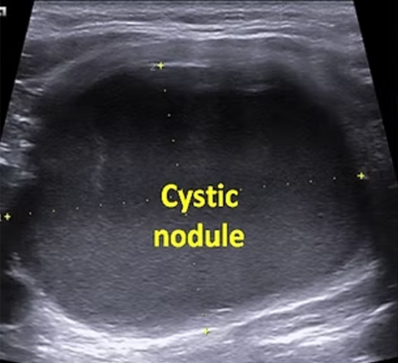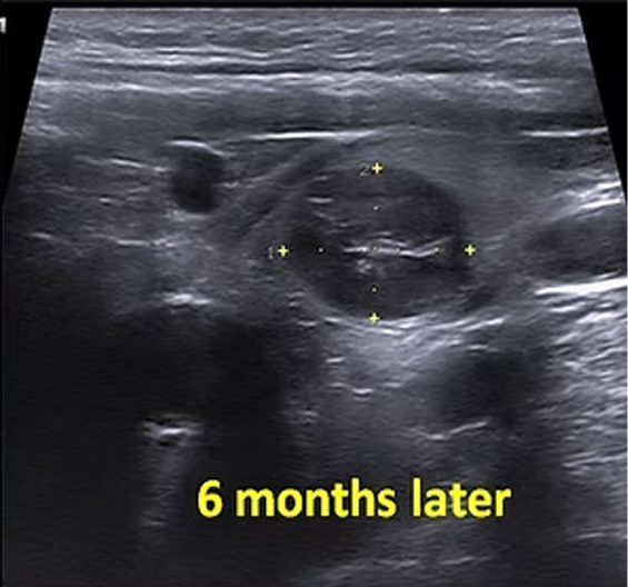 A 45-year-old woman with a giant cystic nodule in the right thyroid lobe underwent ultrasound-guided alcohol (ethanol) ablation. Six months later, the swelling of the patient disappeared, and the ultrasound showed a volume reduction of more than 90%.