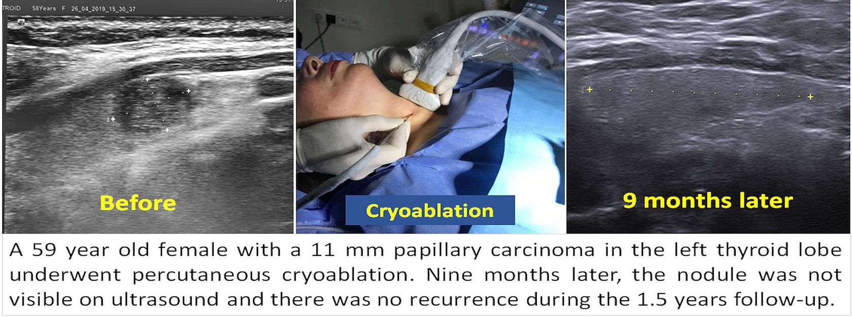 For these reasons, cryoablation is the most preferred method in our Varisson Clinics in the treatment of thyroid nodules diagnosed as cancer or suspected to have cancer on biopsy. In our clinics, we have applied percutaneous cryoablation in hundreds of such patients since 2017 and none of our patients have developed a permanent complication, and no recurrence has been observed in the treated tumor. With cryoablation, we were able to treat also large (upto 5 cm papillary or follicular cancers) successfully.