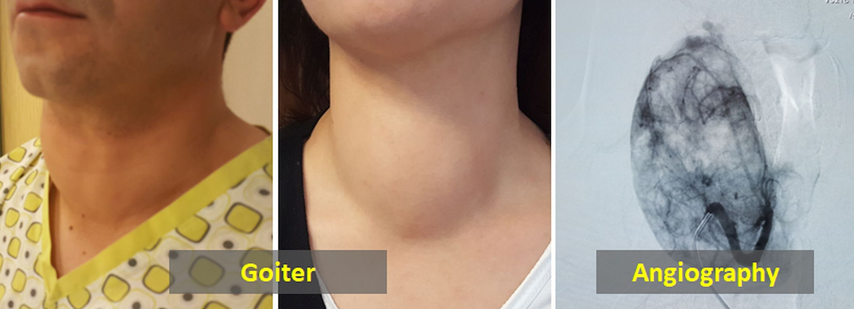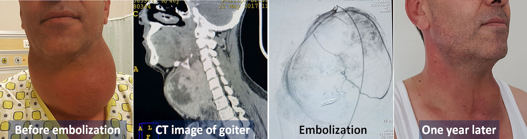 Surgically challenging goiters such as plunging or giant goiters can be easily and effectively treated with embolization, in which the feeding vessels of the goiter are occluded angiographically. After embolization, such goiters decrease in size substantially (around 80% volume reduction) in 6 months, which also continues thereafter for years. After the goiter shrinks compressive symptoms like hoarseness, swallowing difficulty and shortness of breath either disappears or decreases substantially.