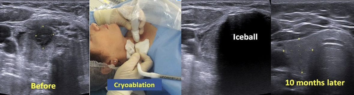 A 50 year old female with a 13mm incidentally detected papillary carcinoma in the left thyroid lobe underwent percutaneous cryoablation. On ultrasound, a large iceball was formed that completely covered the tumor. Ten months later, the nodule was not visible on ultrasound