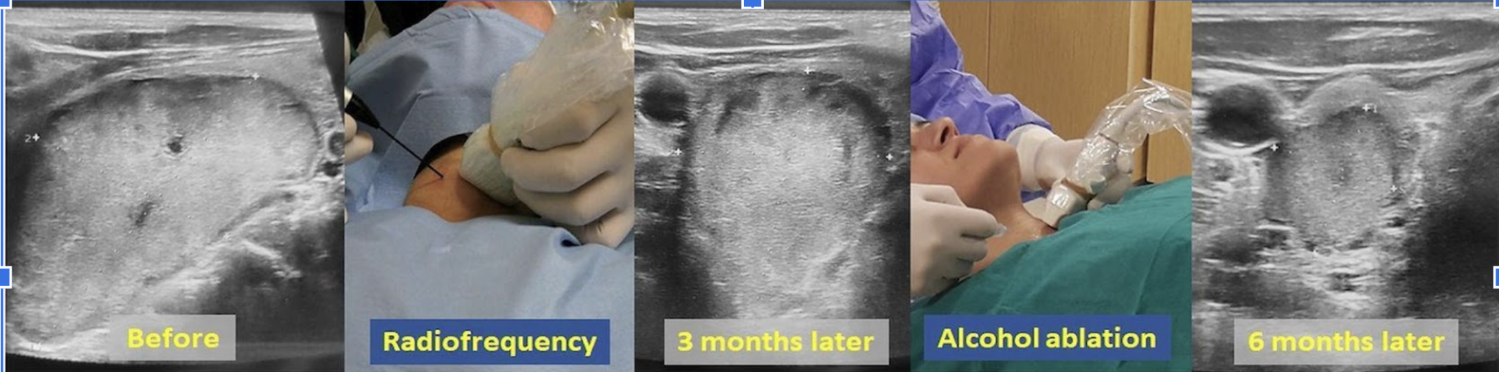 In MNG patients, new options such as percutaneous ablation and embolization has been increasingly used in the last 2 decades. In percutaneous ablation, special needles are inserted through the skin into the nodules and the nodules are destroyed with several methods. These include heat-based ablations (laser, radiofrequency, microwave), cold-based ablation (cryoablation) and alcohol ablation. After percutaneous ablation, the treated nodules shrink significantly and their symptoms such as hoarseness, shortness of breath and swallowing difficulty may decrease or disappear.